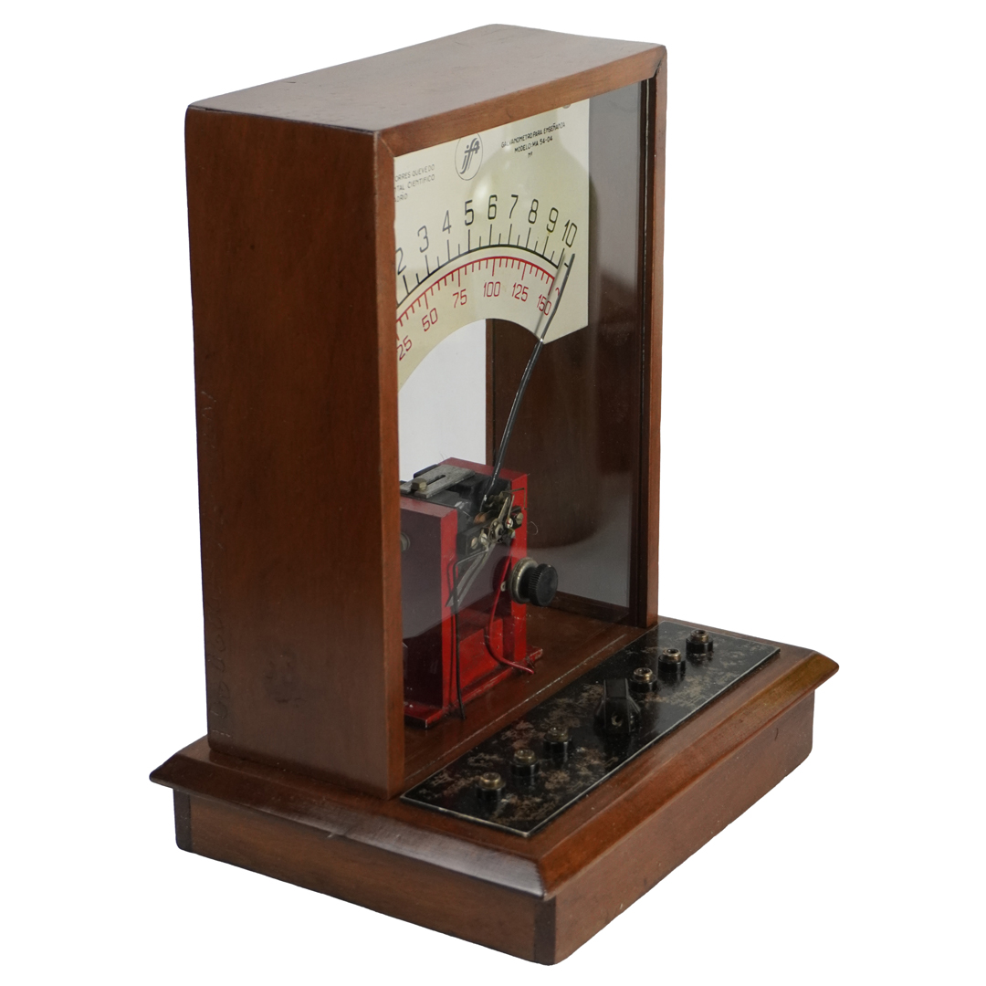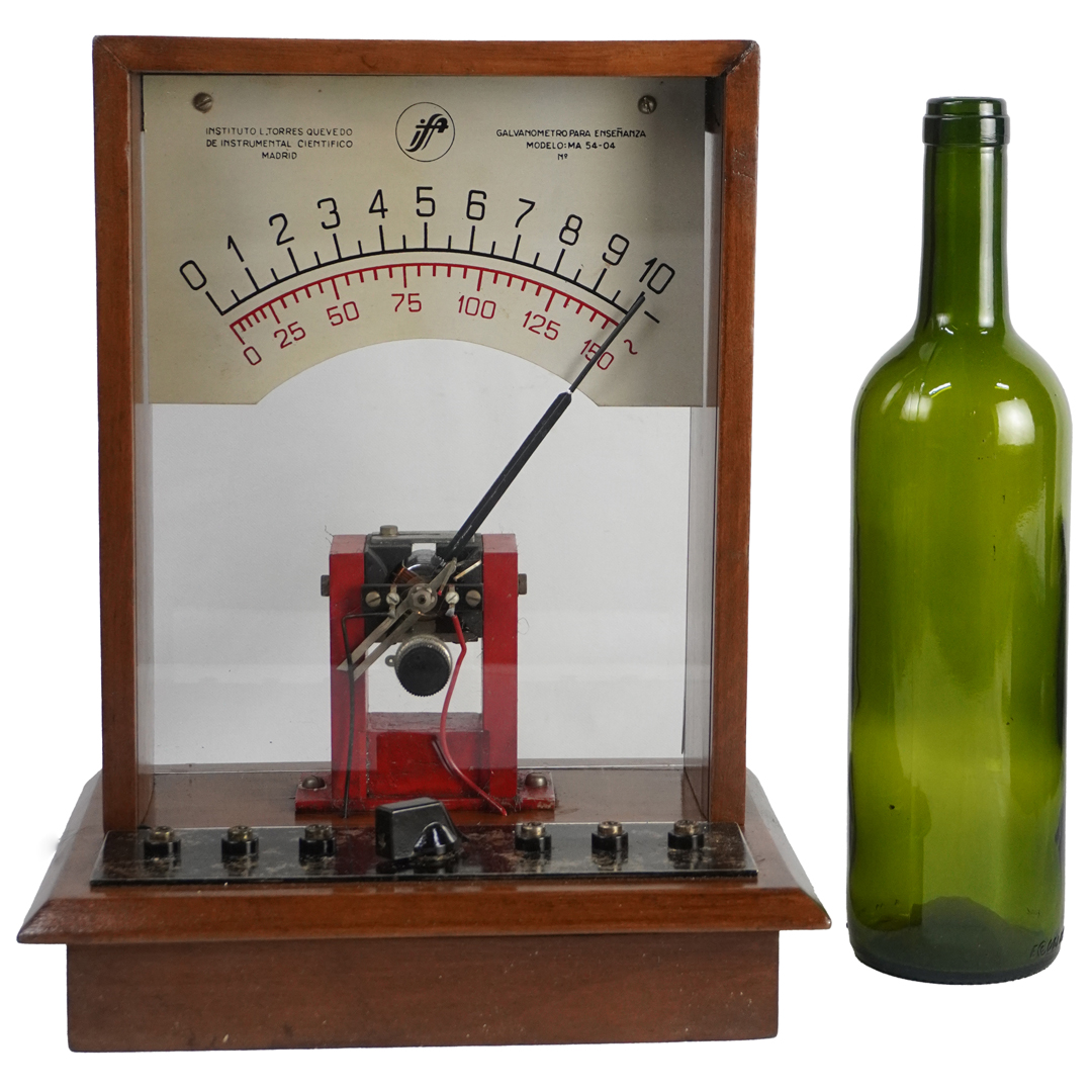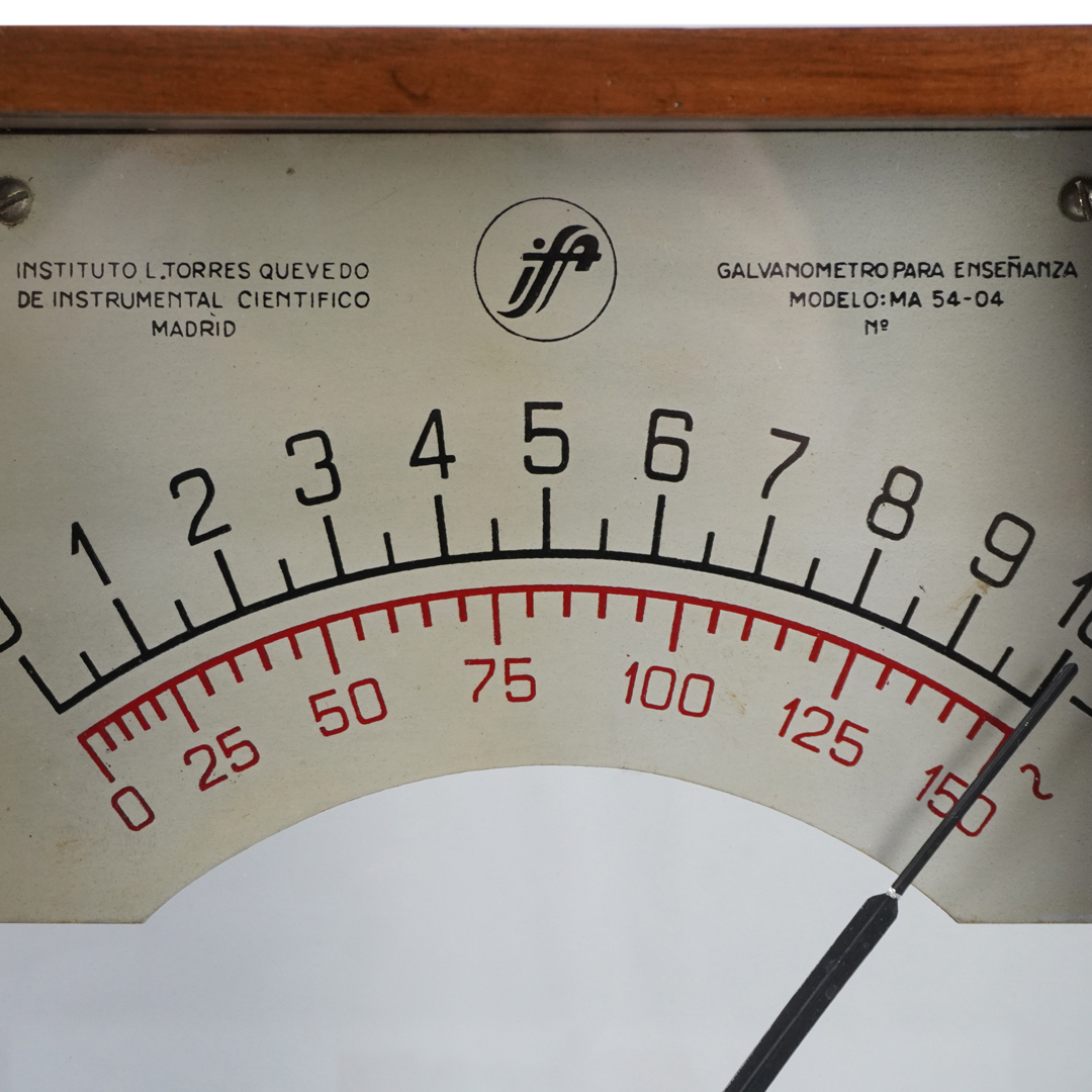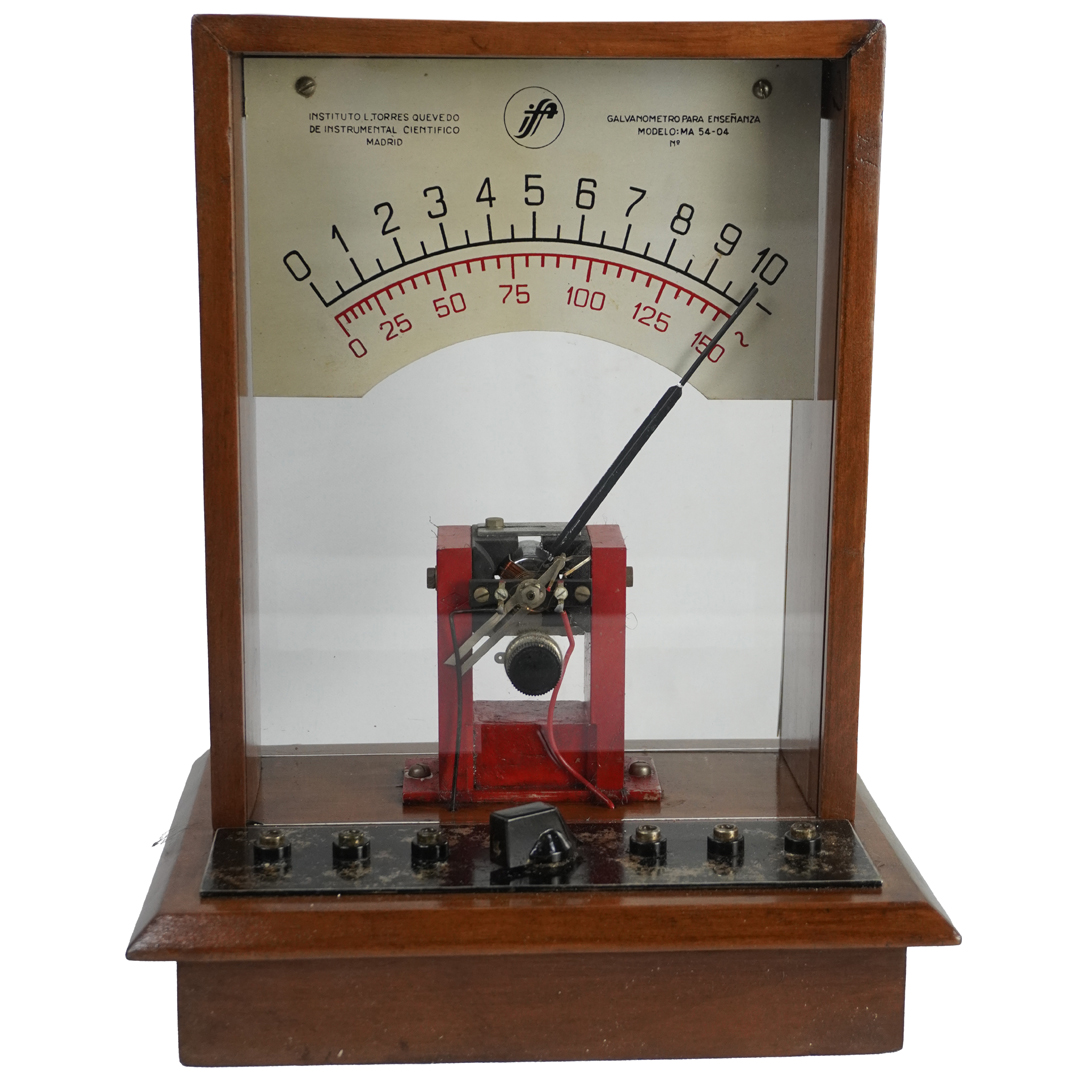 El galvanómetro es un instrumento inventado en el siglo XIX para detectar y medir corrientes eléctricas muy pequeñas. El modelo MA 54-04, fabricado por el Instituto Torres Quevedo de Instrumental Científico en Madrid, estaba diseñado para fines educativos, permitiendo a estudiantes visualizar el desplazamiento de una aguja en función de la intensidad de corriente que circulaba por una bobina móvil.