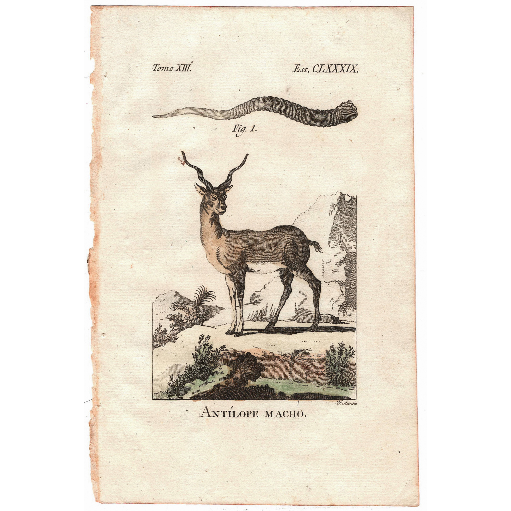 Antiguo grabado coloreado a mano de Josef Asensio “Antílope macho”
